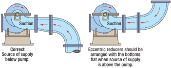 When the source of supply is above the pump, then the eccentric reducers must be placed with the flat side down. When the source of supply is below the pump, then the eccentric reducers must be placed with the flat side up.